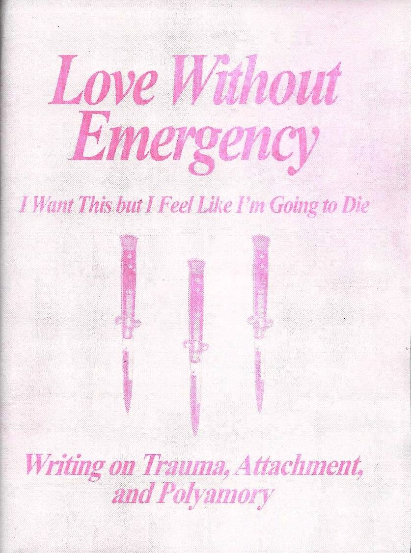Love Without Emergency: I Want This But I Feel Like I’m Going to Die is a collection of writing on trauma, attachment, and polyamory. For the first time, I have collected all my writing on the subject in one place. The pieces in this zine were written between 2014 and 2019; including my early writing on polyamory as well as my more recent work. This zine moves away from simple (and often judgmental/shaming) frameworks around managing jealousy, and toward a recognition of the distress traumatized and attachment injured people can feel when trying to navigate polyamory. Understanding distress as an embodied, nervous system experience, rather than simply a cognitive one, this collection of writing is trauma and attachment informed. Normalizing and validating distress while exploring the experience of earning secure attachment and developing nervous system regulation, this zine draws on both my personal experience as an anxiously attached polyamorous person living with c-ptsd, and my experience as a facilitator teaching my Trauma Informed Polyamory workshop. It’s a thick zine with fourteen pieces of writing covering topics such as non-hierarchical polyamory, queer platonic love, shame, anxious preoccupied attachment, avoidant attachment, desiring polyamory, and nervous system regulation. This zine celebrates trauma survivors and the hard work and great courage we put into love.